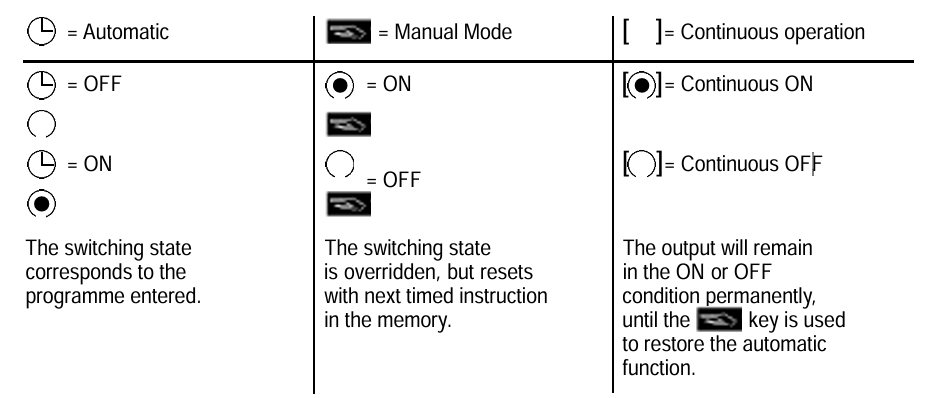 This changes the current switching state without affecting the programmed memory. During timed operation use the MANUAL MODE key to select settings as described in the table below.